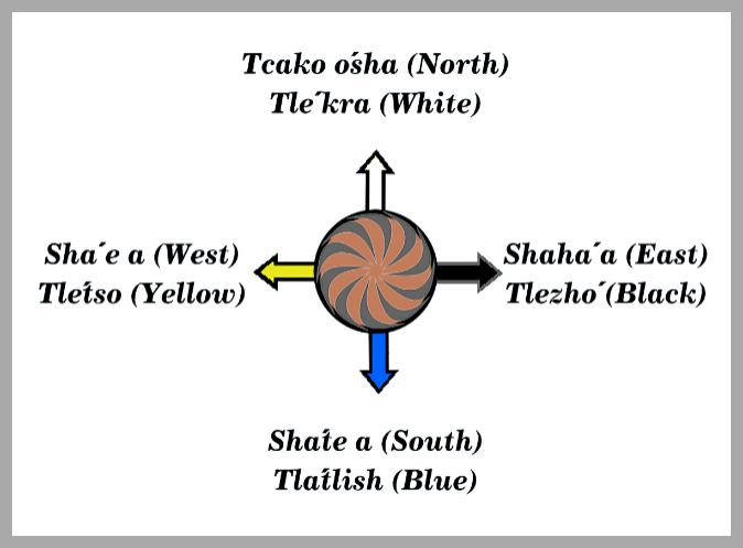 The name Lipan means “The Light Gray People.” It comes from the Lipan word for a light gray color (łépai) and the word for The People or The Tribe (indeh or ndé). Yet, it is more than just a tribal name, for it contains a code which commemorates the Lipan Apache’s ancient journey from the McKenzie Basin of Canada to their eventual homeland of Texas. The Lipans, and all Apaches, see the Earth as a circle suspended in space at the four points of the compass. Each direction is represented by a color: North=White, West=Yellow, South=Blue, and East=Black.
